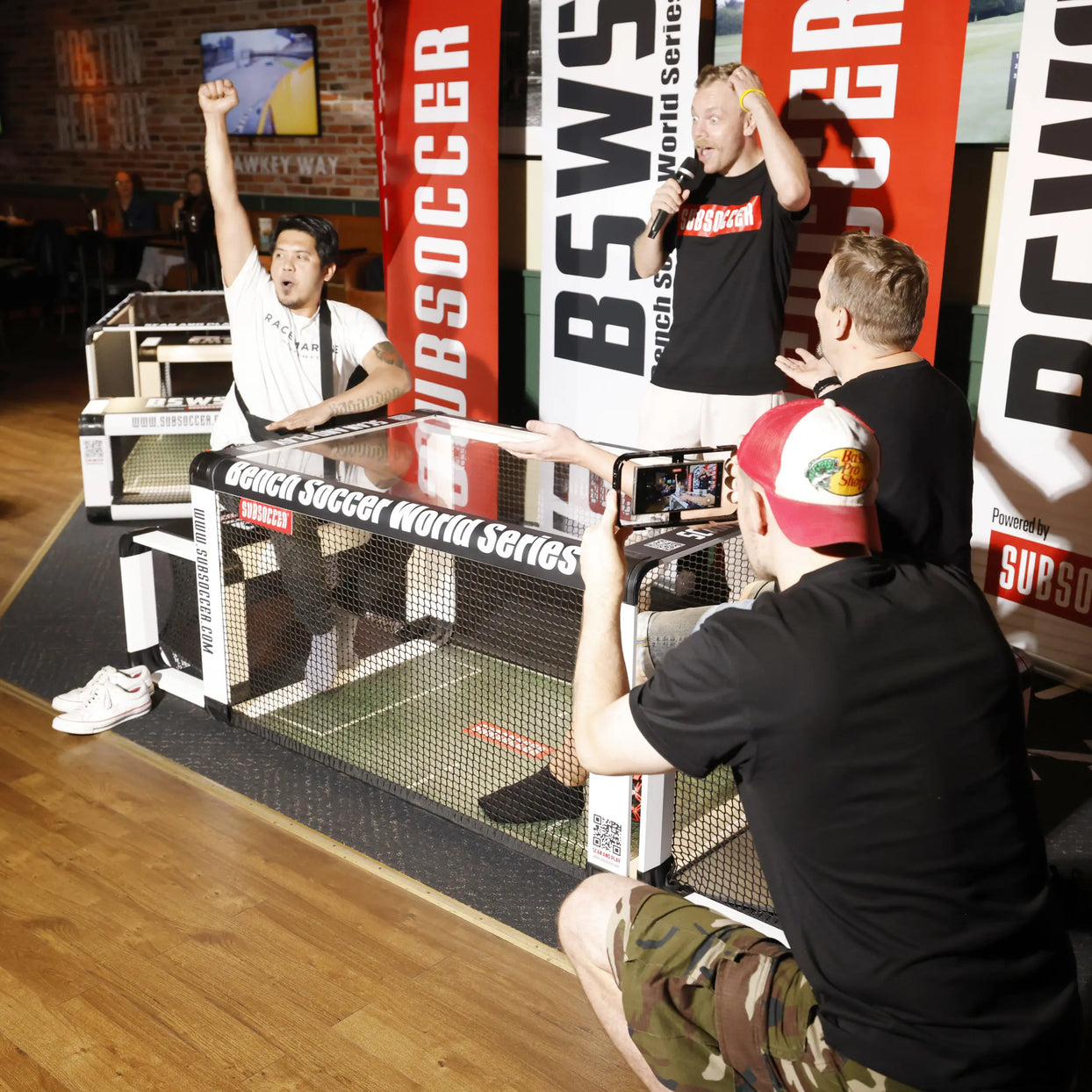 Subsoccer is a contact sport. In active playing circumstances, players should consider general safety and the possibility of contact, due to the nature of the game. Initially, you should get accustomed to the feel of how to play the game in a sitting position. The focus must be on the fundamental dimensions of the game area and the length of your legs. The best and only position is when you sit on the chair, your legs don’t reach over the game table’s halfway, so called field central line. The product is safe to play one on one in accordance with the safety rules.